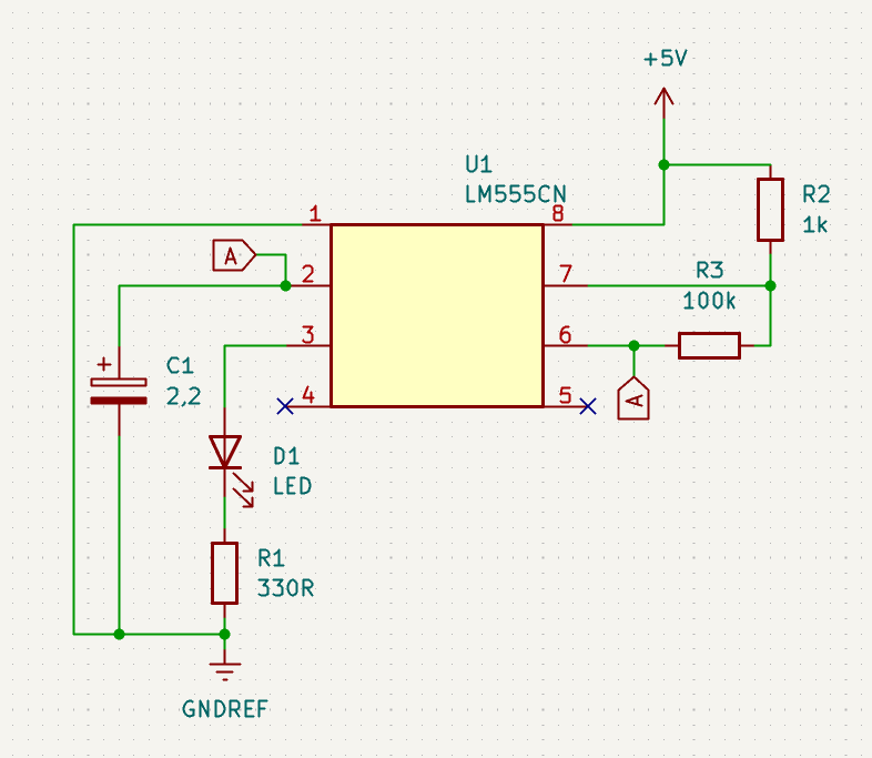 Je suis la vidéo Astable 555 timer - 8-bit computer clock - part 1. Un LM555, un condensateur, trois résistances et hop, on a une horloge basique qui fait clignoter une LED. Le plus long a été de remettre la main sur un adaptateur pour la breadboard.