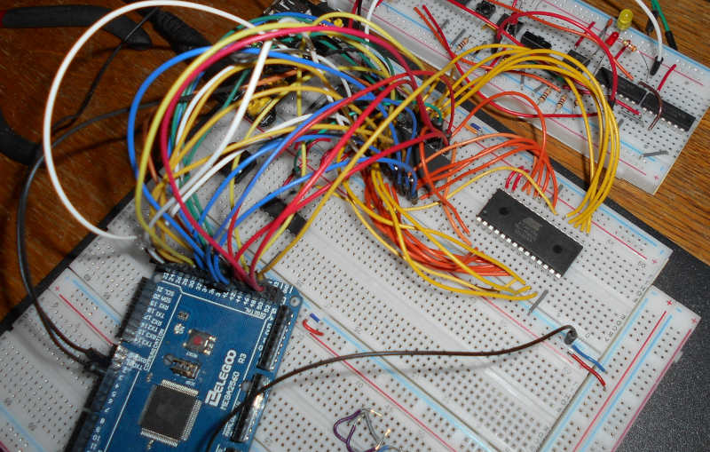 Une fois la ROM programmée et remise en place, je recable l’arduino Mega sur le processeur pour lire les valeurs du bus d’adresse et du bus de données. Il y a tellement de cables qu’on ne voit même plus le processeur :D